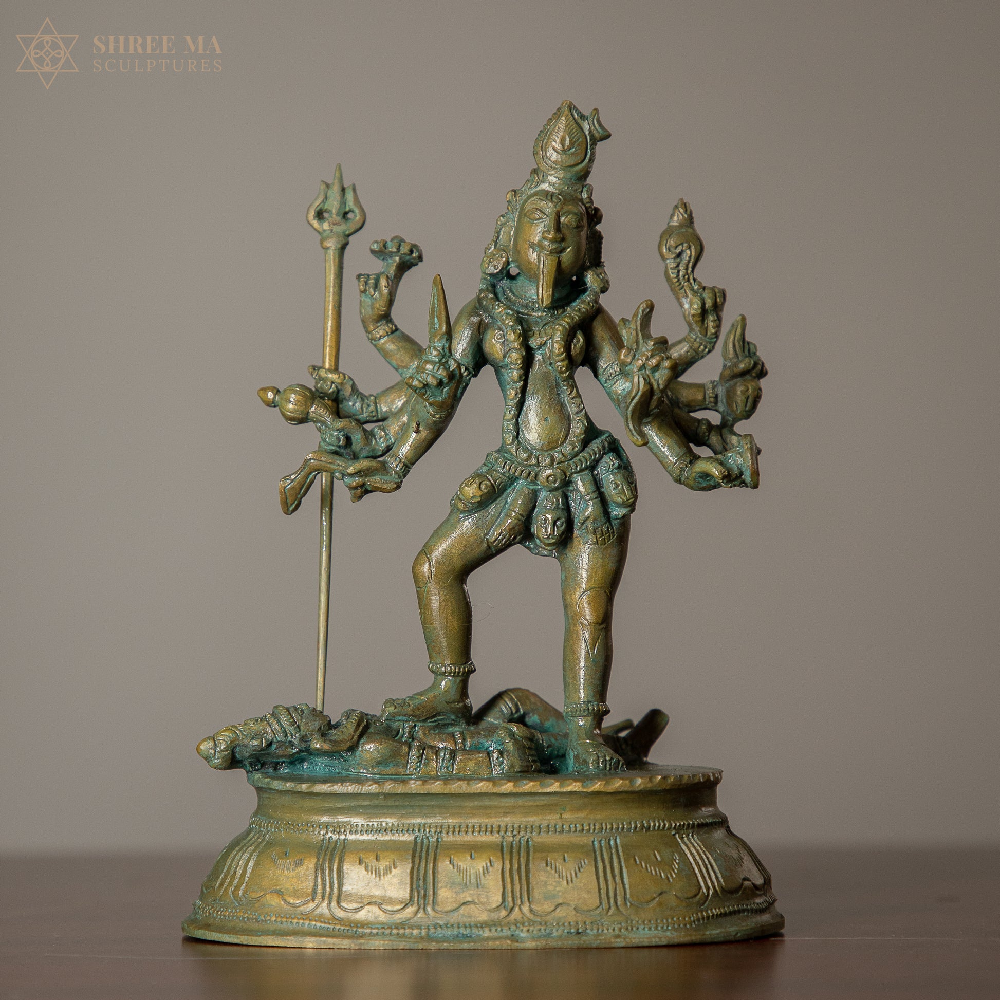 Handcrafted in Panchaloha with an antique finish, the sculpture highlights intricate details in her posture, weapons, and expression, capturing the intensity of her presence. Perfect for pooja rooms or meditation spaces, it invites blessings of protection, fearlessness, and spiritual transformation.